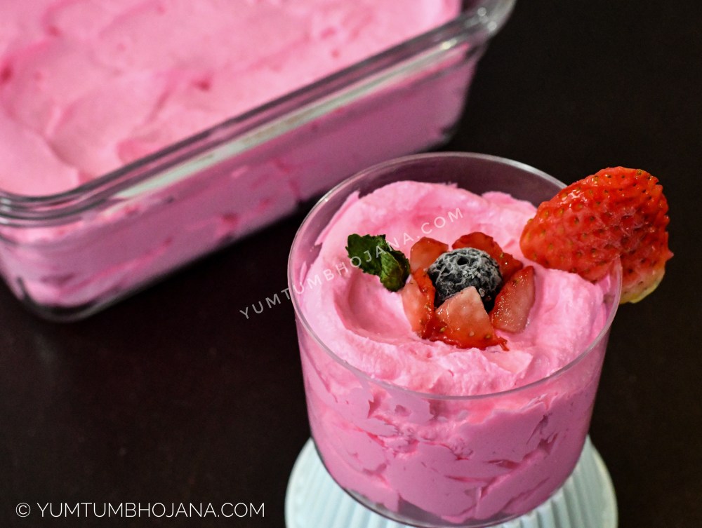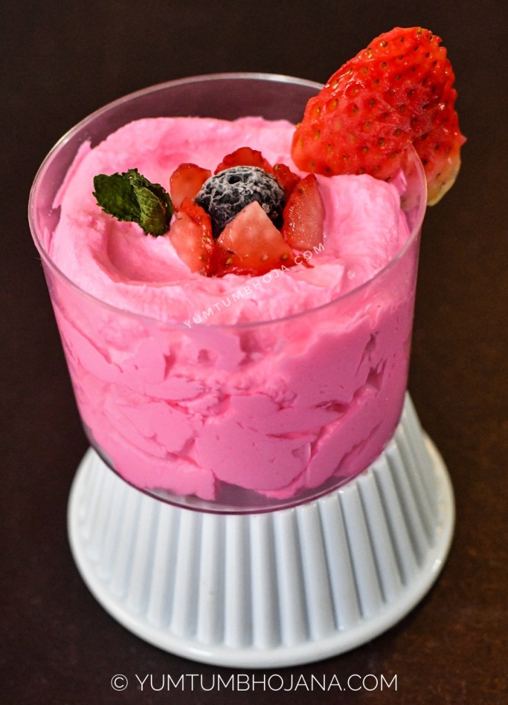 In my previous post, I shared about red velvet cake jamun trifle. In that recipe I have used rose cream as one of the layer. I was very fascinated with trifle always. So, decided to make something for our anniversary and I made it. We enjoyed this as a family. My daughter loves eating this cream as such like an ice cream. You can also add some nuts and fruits to it and enjoy as such 🙂 I hope you all enjoy this recipe as much as we do 🙂 🙂