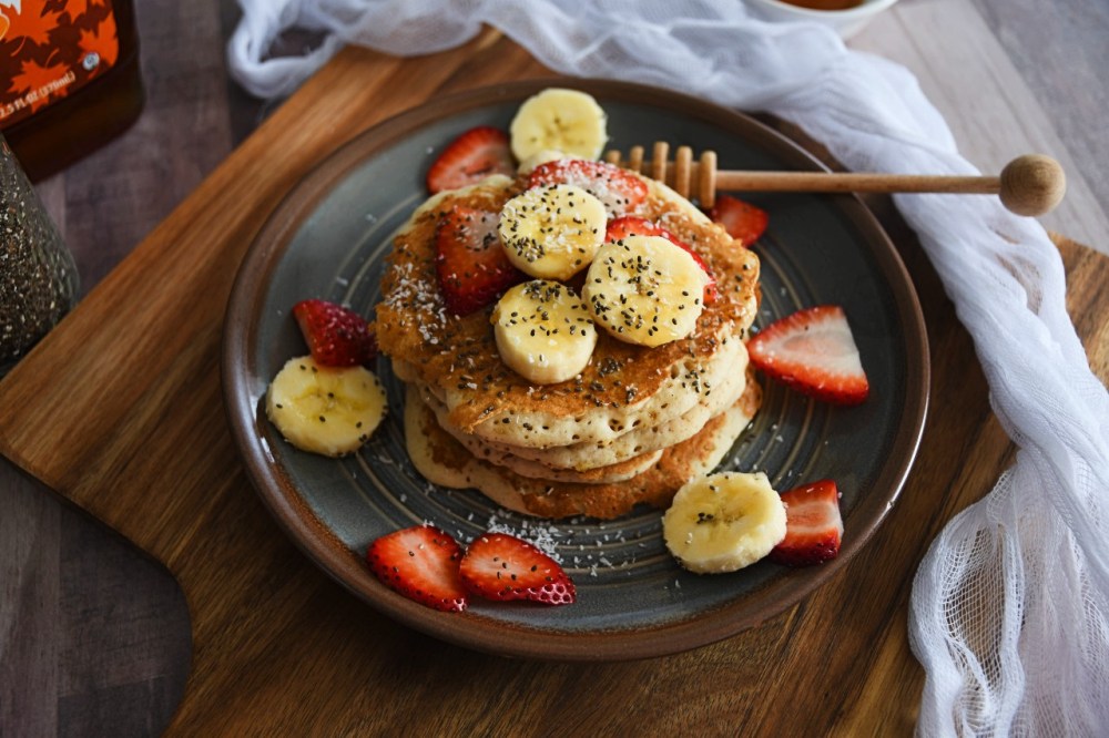 The most common topping for pancakes is maple syrup, but butter is also an option. Other serving ideas include combining mixed berries, banana, dessicated coconuts, nuts, and chia seeds with a drizzle of maple syrup, or you may top it with whipped cream and sprinkles.